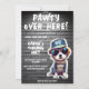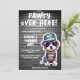 Invitation de fête de premier anniversaire du cool. Design propose un chiot hip hop portant un casquette instantané bleu, un sweat - shirt à capuche, des lunettes de soleil d'aviateur et une chaîne d'or. Arrière - plan de mur en brique gris foncé. Design urbain. Super pour les petits garçons d'un an.