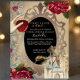 Cette invitation magique et enchanteresse à la fête présente un thème de conte de fées Blanche Neige. Un miroir magique doré est placé à l'avant, avec le texte au centre. Le classique Une fois sur une phrase de conte de fées du temps est imprimé en haut dans une police d'or fantaisiste. Un beau château princesse est placé en bas à droite, et une image de la main de Blanche Neige tenant une pomme venimeuse est imprimée en haut à gauche. Les roses rouges accentuent les limites de l'invitation. L'arrière - plan est un motif de papier parchemin rustique qui ressemble à un vieux livre d'histoires.