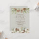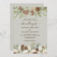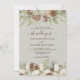 Des cônes de pin d'hiver et des fleurs blanches bordent les bords d'un beige avec d'élégantes faire-part de mariage de script.