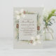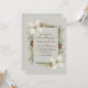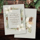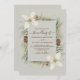 Cônes de pin d'hiver et fleurs blanches sur un beige avec élégant faire-part de mariage de script.
