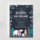Célébrez le premier anniversaire de votre petit avec ces invitations amusantes, colorées et hivernales à l'anniversaire d'un derland, avec des animaux mignons (un ours et un lapin), des flocons de neige, des branches de pins et des sprigs de baies en turquoise, or, gris, rose et blanc sur un arrière - plan de la marine sombre. Le dos de la carte a un motif correspondant !