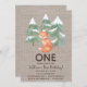 Cette carte d'invitation pour la première fête d'anniversaire du renard boisé d'hiver est parfaite pour une fête d'anniversaire rustique. Le design neutre du genre présente des animaux mignons dans une scène de forêt hivernale.