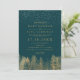 Mariage de forêt de pins d'hiver avec pins dorés montrant un pays merveilleux de bois et de neige blanche, avec une typographie élégante et moderne sur le bleu éditable.