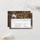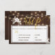Script de calligraphie or mariage RSVP avec options de menu avec bouquet de fleurs blanches rustiques et cordes de lumières scintillantes sur arrière - plan de bois marron foncé grange. ++++++++++++++++++++++ Idéal pour l'hiver | élégant rustique chic | ferme de campagne mariages à thème. ++++++++++++++ Si vous n'avez pas besoin des options de menu, supprimez les textes correspondants dans les zones !