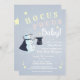 Une illustration moderne, mignonne et aquarelle d'un bonhomme de neige magicien décore ce modèle d'invitation baby shower neutre et ludique avec un thème magique.