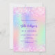 Une invitation à la fête du 21e anniversaire féminine et féminine. Devant : Un arc-en-ciel, arrière - plan de couleur holographique en violet, rose, vert menthe. Décoré de mousseux roses rousses. Personnalisez et ajoutez un nom et des détails du parti. Le nom est écrit avec un script de style écrit à la main, des lettres de couleur violette.