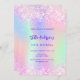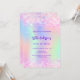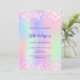 Une invitation à la fête du 10e anniversaire féminine et féminine. Devant : Un arc-en-ciel, arrière - plan de couleur holographique en violet, rose, vert menthe. Décoré de confettis rose vif. Personnalisez et ajoutez un nom et des détails du parti. Le nom est écrit avec un script de style écrit à la main, des lettres de couleur violette.