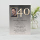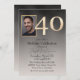 Cette invitation personnalisée présente un thème sophistiqué de fête du 40e anniversaire masculin. Un exemple de photo est imprimé sur la gauche avec un cadre doré, et un grand "40" imprimé à côté dans un dessin de feuille dorée assorti. Vous pouvez personnaliser l'invitation à inclure votre propre photo personnalisée ou autre image. L'arrière - plan est décorée d'un motif de dégradé de feuille noire sur une couleur beige brun. Il est parfait pour un anniversaire ou une autre occasion spéciale.