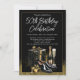 Célébrez en style avec notre Classy Homme N'importe quel numéro Invitation de fête d'anniversaire! Doté d'élégants cadeaux noirs et or, de champagne et de chaussures d'habillement sur un arrière - plan sophistiqué noir et or. Parfait pour une célébration inoubliable et haut de gamme. Personnalisez avec votre âge et les détails de l'événement.