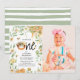 Elégante aquarelle whimsical bee thème 1er anniversaire invitation. Design comprend une photographie de votre enfant Onderful, une bordure de feuillage botanique vert luxuriant, des fleurs marguerites blanches et jaunes, un nid d'abeille et un pot de miel avec de jolies abeilles bourdonnantes. Le titre "So Sweet to Bee ONE", suivi par les détails de la fête d'anniversaire sous en serif et calligraphie en lettres.