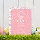 This coquette "Hop on over" girl's baby shower invitation features hand-drawn bunnies and a basket with Easter eggs framed by a bow frame on a pink background. The reverse side features a white background with a pink bow pattern. Personalize it for your needs. You can find more elephant products at my store.