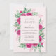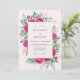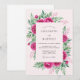 This design features a vibrant arrangement of fuchsia roses and peonies nestled among lush green foliage. A soft pink backdrop enhances the romantic watercolor aesthetic, perfect for a seasonal ceremony. Delicate leaves in emerald and sage create a balanced botanical border. The palette is bright and energetic.