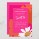 Personnalisable rose chaud et orange abstrait avec un design floral de marguerite blanc rétro. Invitation de fête d'anniversaire personnalisable avec n'importe quel âge, nom et détails de fête désirés.