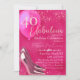 Cette invitation personnalisée présente un thème glamour de fête du 40e anniversaire sur un arrière - plan rose chaud perle. L'expression "40 & fabulous" est imprimée en haut dans une police de script. Un grand ballon rose chaud est placé sur la gauche avec "50" imprimé à l'intérieur. Les feux de parties scintillant mettent l'accent sur les parties supérieure et inférieure. Une belle bande de diamants est imprimée sous le nom de l'invité d'honneur. Une paire de talons hauts roses brillants est photographiée en bas à gauche. Il est parfait pour un anniversaire, un anniversaire ou toute autre occasion spéciale.