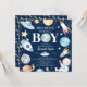 Adorable invitation à la douche bébé garçon avec un astronaute, des bateaux à fusée, planètes & étoiles sur un arrière - plan bleu foncé. Retournez notre invitation mignonne aux garçons pour voir une étoile de tir de coordination. Visitez notre boutique pour toute notre gamme, y compris les cartes de tirage de tombola et de livre correspondantes.