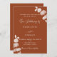 Arrière - plan orange foncé, décoré de tiges d'eucalyptus, sprigs. Personnalisez et ajoutez vos noms et les détails. Dos : arrière - plan orange brûlé foncé. Ajoutez l'URL de votre site Web mariage au code QR pour que vos invités puissent rechercher plus de détails/RSVP