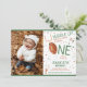 Célébrez le 1er anniversaire de votre petit nouveau-né avec cette invitation d'anniversaire, avec une photo personnalisée de votre bébé. Cette carte d'invitation vibrante présente d'adorables décorations de football américain, des couleurs vert et marron, des confettis qui dynamisent l'atmosphère et un mégaphone qui ajoute de l'excitation. Avec cette esthétique ludique, cette invitation d'anniversaire visuellement étonnante sur le thème du football américain est parfaite pour les parents qui cherchent à créer une célébration mémorable de la première année pour leurs enfants. Alors, dentelez vos chaussures et laissez votre petite étoile briller et profiter d'une journée de plaisir avec cette invitation d'anniversaire.