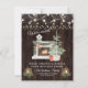 Conception de carte unique avec sapin de Noël, cheminée, vieilles lampes avec bougie, verdure hivernale, guirlandes lumineuses sur fond de bois de grange ancien. Utilisez l'outil Personnaliser pour ajouter vos informations. Voir également ma collection We Have Moved.