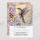 A delicate watercolor illustration featuring a graceful hummingbird in mid-flight, surrounded by blooming lavender and blush flowers. The bird’s iridescent wings shimmer with shades of lilac, blue, and soft gold as it hovers gently against a warm, pastel sky. Flowing florals frame the scene, creating a romantic, airy atmosphere that evokes love, joy, and new beginnings. The back of the card is a variation of the front. Personalize with your own information.