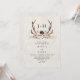 This rustic boho wedding invitation with wood background features the monogram initials of the bride and groom framed by stag antlers which are decorated with a watercolor burgundy floral bouquet, and a banner with the phrase "The Hunt is Over." The QR code with your wedding website and RSVP information is on the back. Please contact me through Zazzle Chat if you need design tweaks, more matching products, or other colorways.