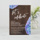 Voici un choix décontracté et rustique pour vos besoins de célébration après le mariage. Sur un fond en bois sombre, j'ai placé un graphique typographique qui dit "célébrons", avec une police de caractères manuscrits modernes. Sur l'image de fond, j'ai placé des hortensias aquarelles avec des teintes bleues, lilas pourpre et des touches subtiles de vert. Faites pivoter les fleurs pour afficher plus ou moins les teintes que vous préférez, afin de correspondre à votre propre palette de couleurs. Utilisez les champs du modèle pour ajouter vos propres détails et cliquez pour personnaliser davantage si vous souhaitez apporter d'autres modifications. Toutes les couches sont déverrouillées pour vous permettre de contrôler le positionnement et la taille comme vous le souhaitez. // 100 //