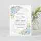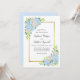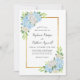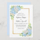 Ces invitations de mariage présentent un design floral moderne avec des fleurs d'hydrangée bleue, des feuilles de roses blanches, du feuillage et une bordure en faux or. Personnalisez-les avec votre propre texte.