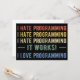 Design amusant, parfait pour toute personne qui est un programmeur, un spécialiste de la technologie, un codeur, un ingénieur informatique, un étudiant en informatique, ou quelqu'un qui aime coder! Je Déteste La Programmation. Ça marche ! I Love Programming'drôle de citation pour les programmeurs, les passionnés de technologie, les codeurs et les développeurs. Aimez-vous travailler dans le domaine de la technologie et faire partie de l'équipe technique? Accentuez votre style avec cet art cool ! Excellent cadeau pour un étudiant de l'informatique, un employé spécialiste de la technologie, un collègue de la technologie ou un professeur d'ingénierie informatique.