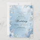 A serene, cool-toned floral arrangement frames a soft, atmospheric blue background. Hints of white blossoms and frosted foliage evoke a gentle, elegant, and tranquil mood.