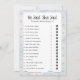 Présentant "He Said, She Said", le jeu de douche nuptiale ultime qui ajoutera une touche de plaisir et d'excitation à votre journée spéciale. Ce jeu interactif est conçu pour divertir vos invités comme ils devinent qui a dit quoi parmi la mariée et le marié. Avec ses questions personnalisées et son design élégant, "He Said, She Said" est l'ajout parfait pour créer des moments mémorables à votre douche nuptiale. Le jeu dispose d'un centre blanc propre et immaculé, fournissant une toile vierge pour le rire et la compétition amicale à se dérouler. Ce qui distingue cette version est la délicieuse bordure en pois gris et vert qui orne le jeu. Les charmants pois apportent une touche de fantaisie et de lucidité au design, complétant ainsi l'esthétique générale. La même frontière à points polka ravissante se poursuit à l'arrière du jeu, assurant une apparence cohésive et visuellement attrayante. Au fur et à mesure que vos invités s'engageront dans le jeu, ils recevront une liste de questions personnalisables qui reflètent les bizarreries et les expériences uniques de la mariée et du marié. Chaque question va remettre en question leur connaissance et leur perception des mots et des préférences du couple. Pour deviner, les invités feront le tour du symbole de la robe mariage s'ils croient que la mariée a dit la déclaration ou du symbole de smoking s'ils pensent que c'était le marié. L'excitation s'intensifie alors qu'ils se disputent pour deviner les réponses les plus correctes. Au bas du jeu, un espace est prévu pour que les invités écrivent leur nom et suivent leur score. Cela ajoute une touche d'organisation, mais déclenche aussi une concurrence amicale entre les invités. Tout le monde appréciera de comparer leurs réponses et de voir qui peut déchiffrer les pensées du couple le mieux. Avec "He Said, She Said", votre douche nuptiale sera remplie de rire, de conversation et d'un sentiment de camaraderie. Ce jeu est le brise-glace parfait et l'entrée de conversation, assurant que les invités de tous les âges et arrière - plans peuvent participer et profiter des festivités. Alors rassemblez vos proches, préparez-vous à une compétition amicale, et laissez le plaisir commencer par "He Said, She Said" - le jeu incontournable pour une expérience de douche nuptiale inoubliable.