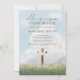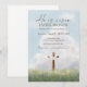 Cette invitation de brunch de Pâques chrétien présente un fond de ciel paisible avec une illustration de croix et le message “Il Est Ressuscité.”