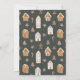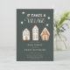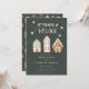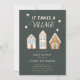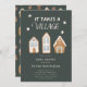 Baby shower à thème de Noël rustique et moderne pour un garçon avec illustration dessinée à la main de maisons en pain d'épice avec des grenades bleues. Le texte dit "ça prend un village."