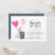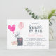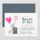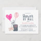 Annulation de dernière minute ? Événement à longue distance ? c'est l'invitation parfaite pour une baby shower par courrier avec une jolie enveloppe aquarelle, un cadeau emballé tenu par 2 ballons rose néon et rose pastel en forme de cœur. Un thème de baby shower bleu marine et rose.