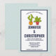 Une invitation de mariage décontractée amusante avec une illustration fantaisiste présentant 2 petits cactus heureux assis dans leurs propres pots de fleurs. Ils ont chacun leurs propres expressions uniques, ayant l'air heureux et joyeux. Le fond est un motif de pois vert menthe.