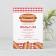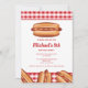 L'illustration de restauration rapide de Destei représentant un pain à hot dog avec une saucisse grillée surmontée de ketchup et de moutarde. Le fond présente un motif à carreaux rouges. Personnalisez le texte avec les détails de votre événement.