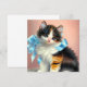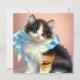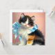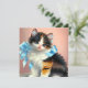 Carte avec un chaton calico mignon. Le chaton porte un ruban bleu assis adorablement sur une table. Un cadeau parfait pour les amoureux de les chats et les amateurs d'art victorien !