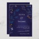 Quelques fleurs blanches, herbes et feuilles de couleur marine, indigo et nid d'abeille, dessinés à la main dans l'aquarelle, sur un indigo, violet et arrière - plan de marine, décorent ce modèle élégant, moderne et simple. Un beau choix pour un couple moderne, un mariage dans le jardin et une célébration magique et intime.
