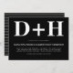 Initiales blanches typographie audacieuse faire-part de mariage noire. Le dos est recouvert d'un motif blanc rayé sur noir.