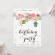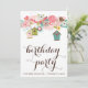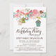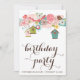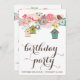 Illustration de tourterelles roses et brunes entourées de fleurs blanches et colorées et de maisons d'oiseaux suspendues. Cette invitation sera parfaite pour les fêtes d'anniversaire d'été et de printemps.