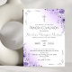 Cette invitation religieuse et élégante de la Première Communion, qui présente une charmante croix argentée et de jolies fleurs violettes, est parfaite pour une première communion catholique. Disponible en espagnol Esta elegante y religiosa invitacion de Primera Comunion, contiene lindas flores moradas y una cruz platada.