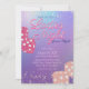 Cette invitation à la fête personnalisée présente un thème glamour de nuit pour dames sur un arrière - plan de couleur irisée. Le titre "Ladies Night" est imprimé dans une police de script de parties scintillant rose, avec une ombre rose néon. Le titre de Game Night est imprimé ci-dessous en violet. Les lumières de fées scintillantes mettent l'accent sur les parties supérieure et inférieure. Des dés de parties scintillant rose foncé et clair sont placés de part et d'autre de l'information de l'événement.