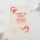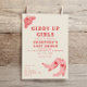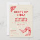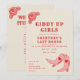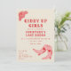 Cartons d'invitation enterrement de vie de jeune fille avec texte décoratif rose et rouge "Giddy Up Girls" et "dernier rodéo", illustration d'une rose et de bottes de cowgirl roses avec des cœurs. Le fond est blanc cassé. Le verso présente l'itinéraire.
