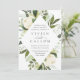 Notre faire-part de mariage de fleurs d'ivoire entoure vos détails de mariage avec un cadre géométrique moderne en forme de losange de verdure aquarelle peinte, feuilles d'eucalyptus, feuillage botanique et fleurs de roses et de pivoines blanches.