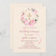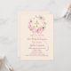 A soft ivory blush background, decorated with watercolored pink and white flowers in a wreath and a golden cross. A pink bow. Personalize and add a name and details.