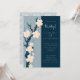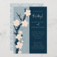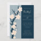 Japandi inspiré faire-part de mariage, avec une branche de fleurs de cerisiers sur le côté gauche de la carte contre un arrière - plan bleu clair, tandis que le texte de l'invitation se démarque sur un fond bleu foncé. Au verso, un motif de coordination en bleu clair ajoute une touche de fusion scandinave à votre suite d'invitations.