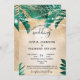 Planifiez votre mariage à la destination de plage d'île tropicale ? Invitez vos invités avec cette belle invitation avec illustration de jarre lumineuse avec des lumières féeriques scintillantes et des feuilles de palmier tropicales sur fond doré