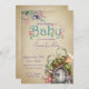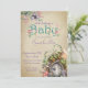 Cette invitation au baby shower magique et fantaisiste présente un thème forestier enchanté. L'image d'une porte de fée dans un petit jardin de champignons est placée en bas, avec une fée qui flotte au-dessus. L'arrière - plan est un motif de papier parchemin défraîchi de style vintage.