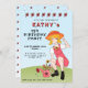 Jolie fille de jardinage avec fleurs Invitation d'anniversaire. Dessin d'une fille avec des fleurs dans une canette d'arrosage et des tournesols. A l'arrière, un motif de tournesol. Ajoutez votre texte et faites une amusante invitation d'anniversaire pour la fille.