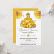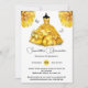Une belle robe de lune de conte de fées jaune faite de fleurs florales de pivoines et de couches de rouffles a un corps serré et est encadrée par deux faux papillons argentés. Des fleurs de pivoines jaunes en pleine floraison apparaissent en haut à droite et à gauche de l'invitation et des modèles noirs pour votre libellé personnalisé apparaissent en dessous de la brune dame. Si votre fille célèbre son 15ème anniversaire quinceañera ; une célébration spéciale ou si vous êtes l'hôte d'une douche nuptiale pour une mariée, cette invitation est idéale. Gâchez votre fille lors de sa journée spéciale avec cet invitation luxueux.