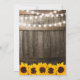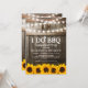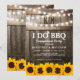 Cartes d'invitation de fiançailles de couple "Je fais du BBQ Rustique" avec un fond de tonneau en bois de grange de campagne, des guirlandes lumineuses, des tournesols jaunes dorés, une bague de fiançailles de mariage, votre monogramme et un modèle de célébration de douche de couple facile à personnaliser.