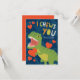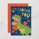 La carte de la Saint-Valentin pour les enfants montre une illustration d'un t-rex vert tenant un coeur rouge sur un arrière - plan bleu avec les mots "Je vous choisis". Conception par Shelby Allison.